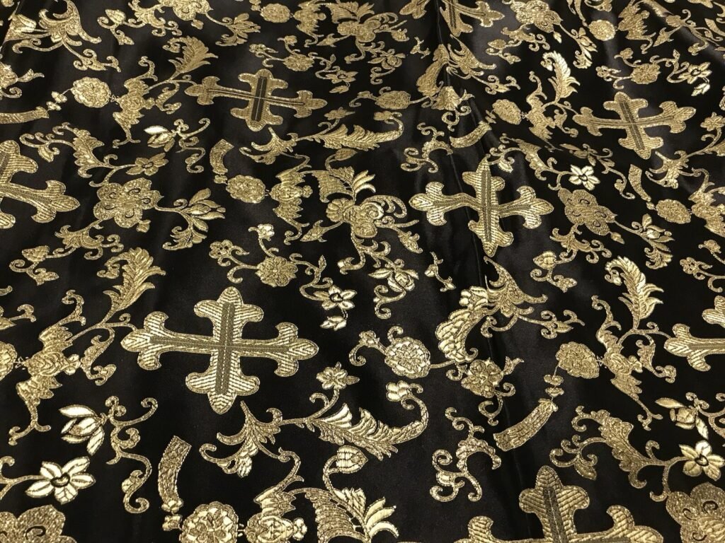 Black Gold Metallic Church Cross Brocade Fabric 60” Width Sold By The Yard